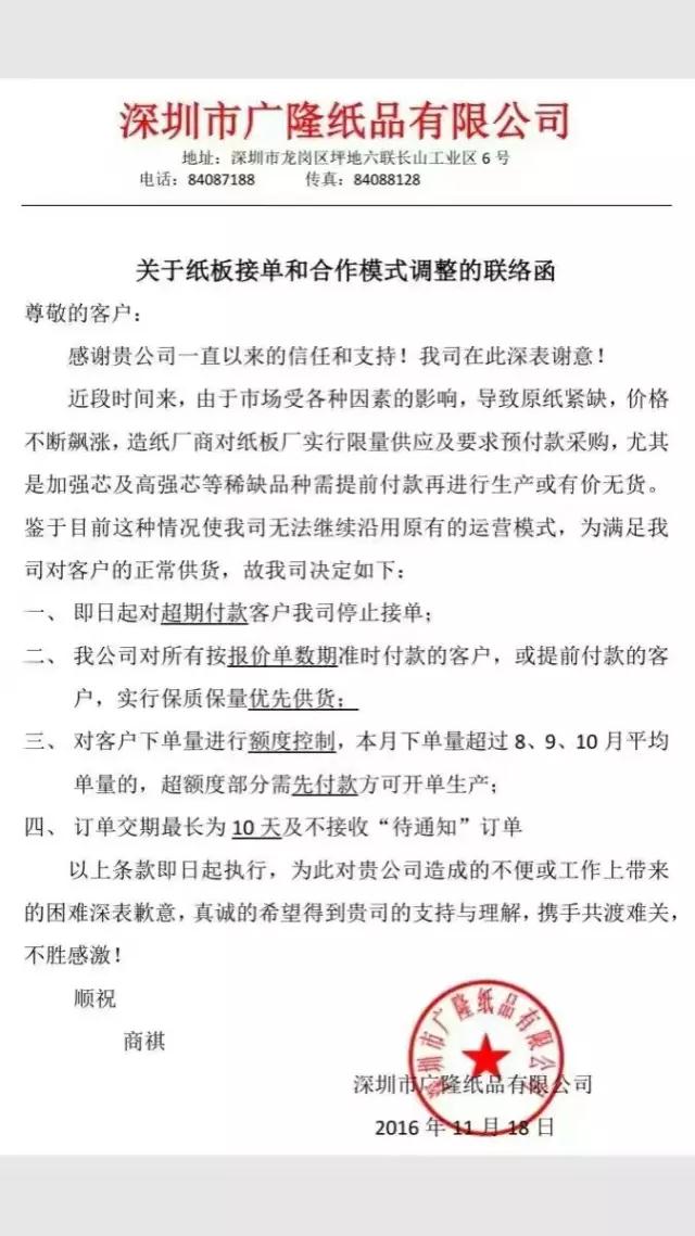 11月19号我不知道别的地方,我知道深圳的原材料紙張漲瘋瞭,一時間所有的包裝行業印刷行業朋友圈都在轉發,我開始憤怒瞭這是要逼著印刷廠都關門嗎?對你們有好處嗎原材料的廠商,你們不想讓我們接單瞭想讓我們斷糧食瞭,沒有紙的日子特别難熬,漫天飛的漲價聯絡單與限産單通知,沒有紙的日子特别難熬,爲什麽說紙價瘋漲也沒人管?並不是要故意制造恐慌 ,也不是要哄擡紙價。就幾天時間公司接到好幾張漲價的通知單,我說如果你告訴客戶他們肯定不願加他的價,這樣的話我們印刷廠就不好接單不好操作 ,你不可能一一的爲你的客戶去解釋吧,就算他們願意聽我們也沒那麽多時間,換個角度如果印刷廠集體罷工的話,那你們紙廠還有什麽資格是合夥漲價,本身今年明年印刷行業都是很困難的,這個雪上加霜的時候還漲價都不知道報的什麽心态。反正我是有圖有真相的等會有同行的可以看看,大家互相轉發抵制他們原材料漲價。深圳市博霖印刷感謝一路支持的客戶和供應商們特殊時候換位思考謝謝。