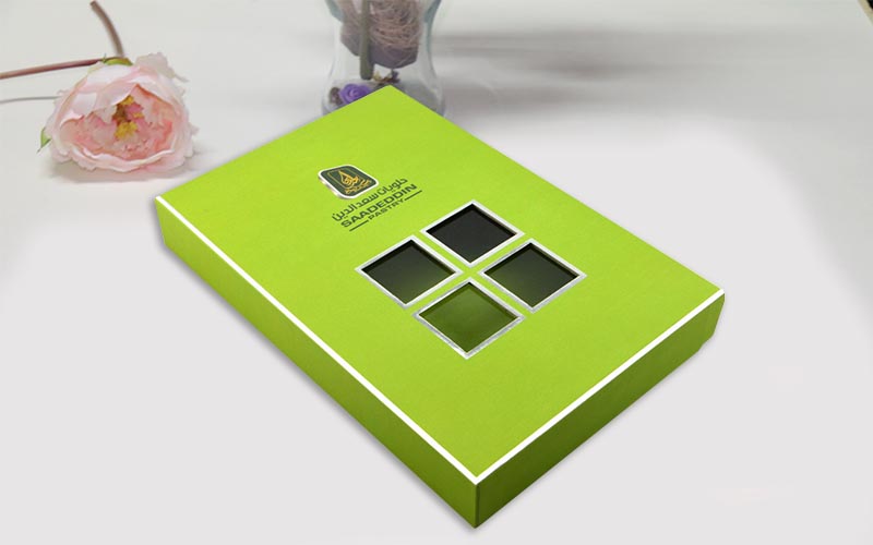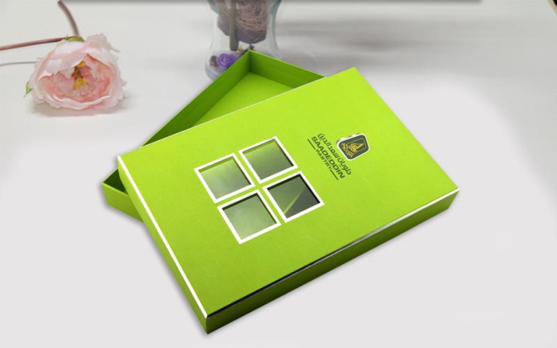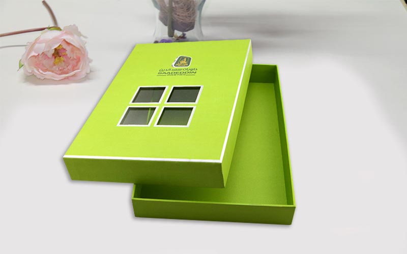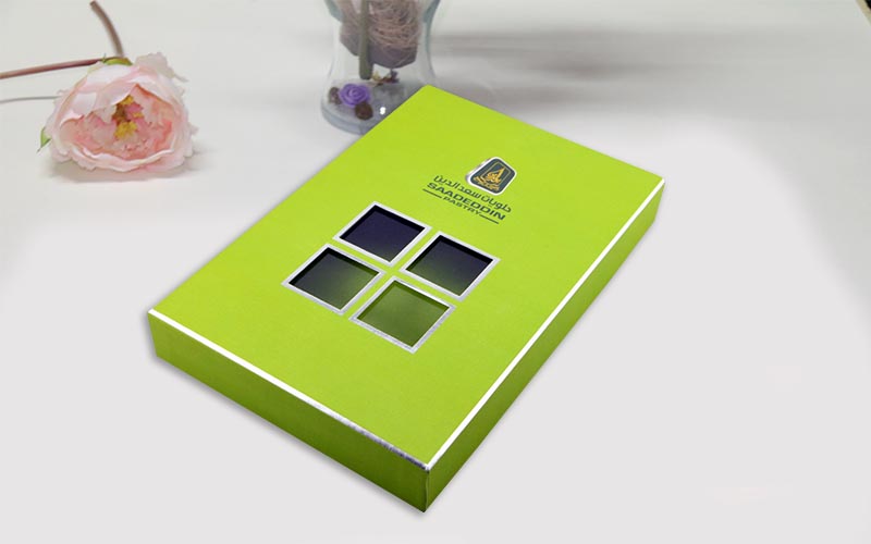1.材質 :盒子面紙用銀卡紙四色印刷,盒子底部打白墨,單面啞膜裱1500G雙灰闆,盒子内部裱一層染色紙,盒型爲天地盒上盒蓋開窗可以隐約看到裏面的産品,更有一種神秘感,流水線制作。