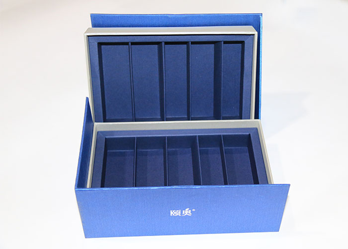 1.材質:面紙採用180G藍色塗布特種紙,絲印白墨文字,内包材質1600G雙灰闆,盒型爲半翻蓋雙層抽屜盒型,整個盒子都是手工精細制作