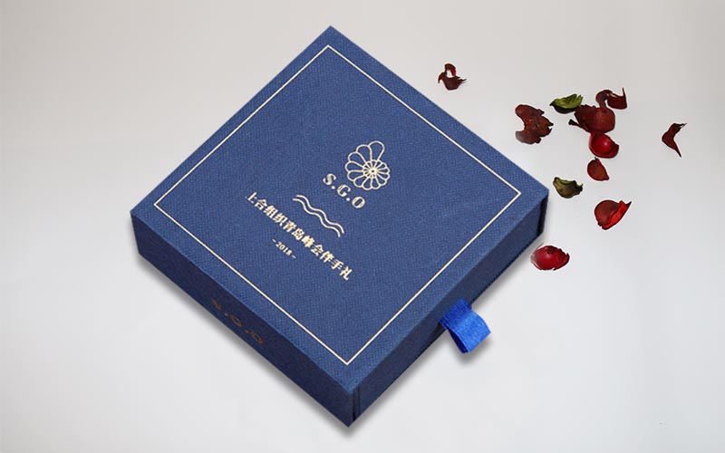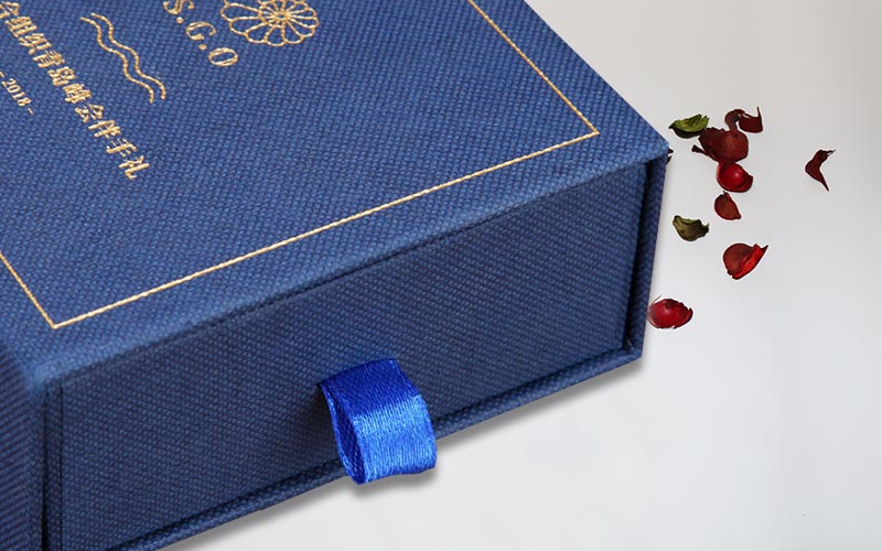 1.材質:盒子面紙採用小石頭紋的藍色特種紙,盒子表面文字LOGO燙金色,裱1200G單白闆,整體盒子爲抽屜盒性,抽拉的地方裝藍色的絲帶。整款盒子手工制作。