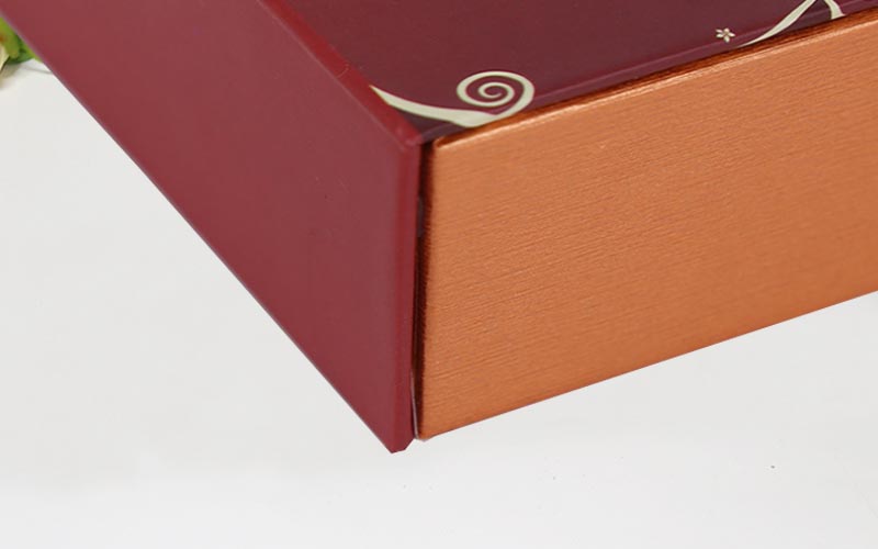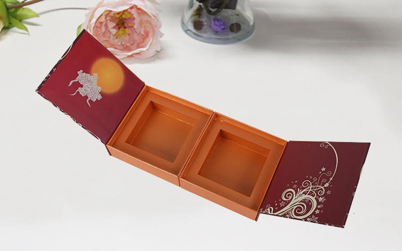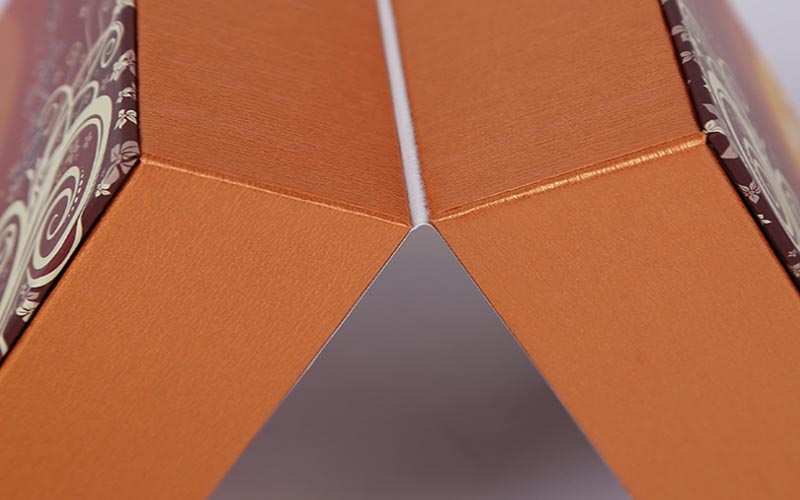 1.材質:盒子用銅版紙彩色印刷裱1500G雙灰闆,内盒橘色紋路特種紙裱1500G灰闆,盒子紙托(裝食品比較環保)盒子盒型爲雙開盒,盒子結構比較複雜手工制作