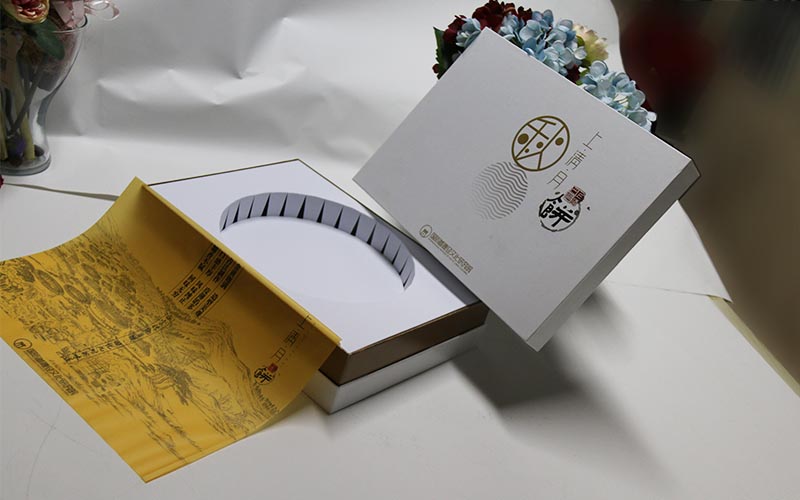 1.材質:盒子面紙採用白色名仕高檔珠光紙,正面絲印四色機印刷+燙黃金,裱1500G雙灰闆+中間金色特種紙内圍條,内托白色坑紙産品上面覆蓋一層金黃色牛油紙單色印刷,整體盒子外觀在加一條中國紅色橡皮筋。