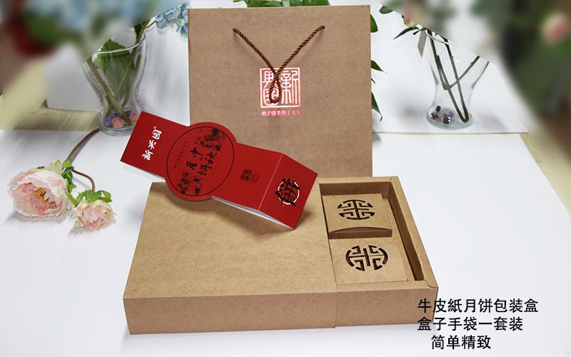 1.材質:此款月餅包裝盒盒子用400G美國進口牛卡紙,空白盒子+外封條銅版紙彩色印刷覆亞膜,内盒300G牛卡紙啤镂空成型,手袋200G牛卡紙燙紅金,穿棕色尼龍繩 。